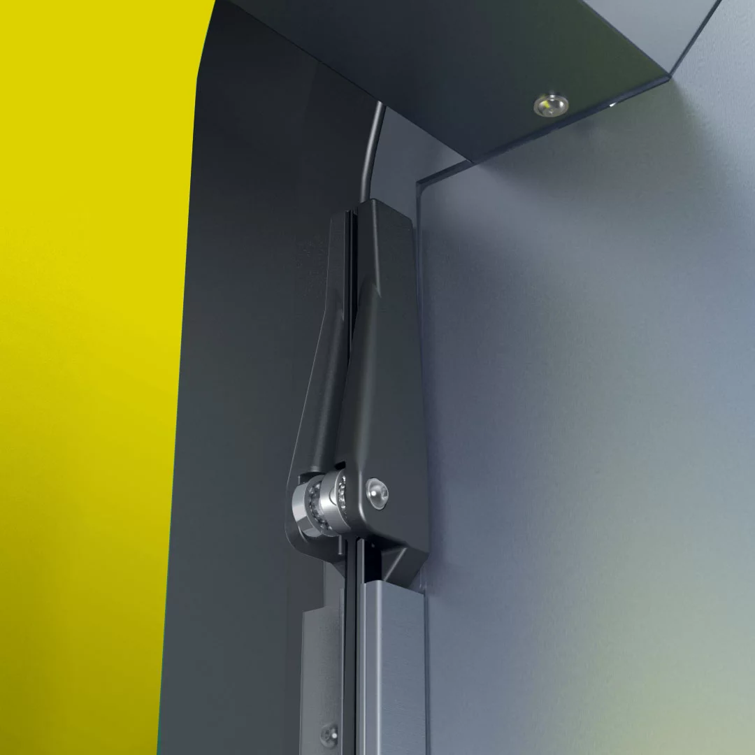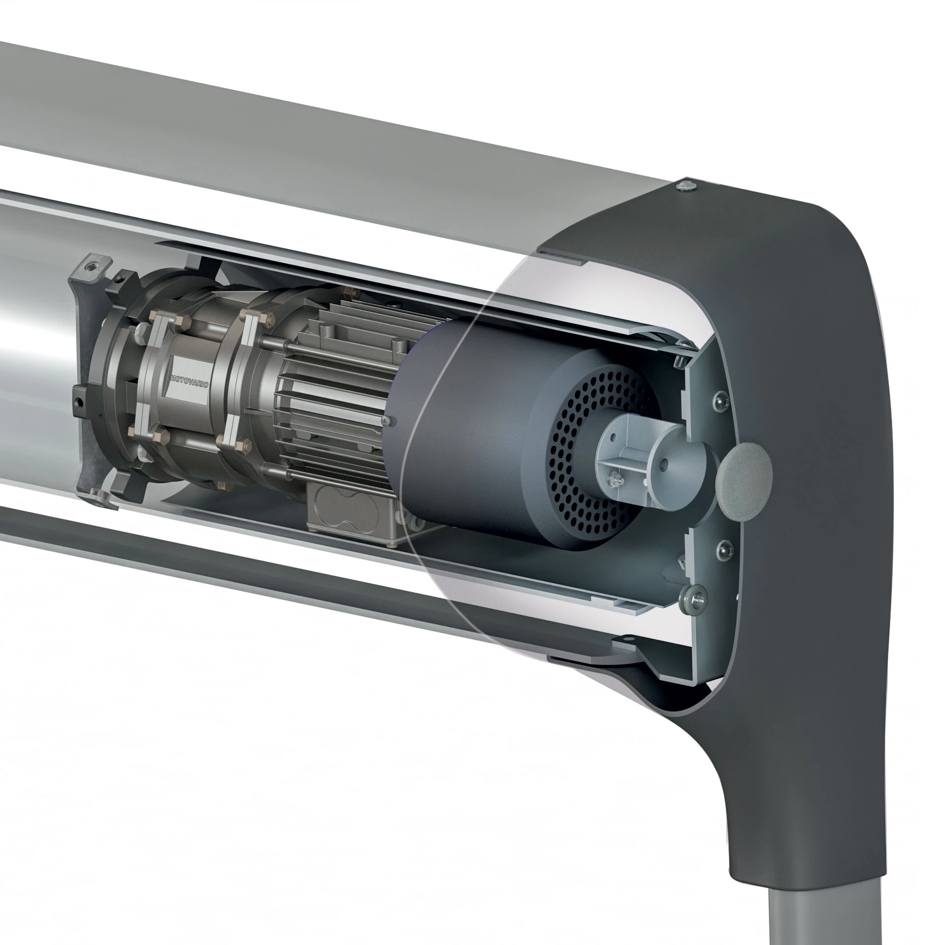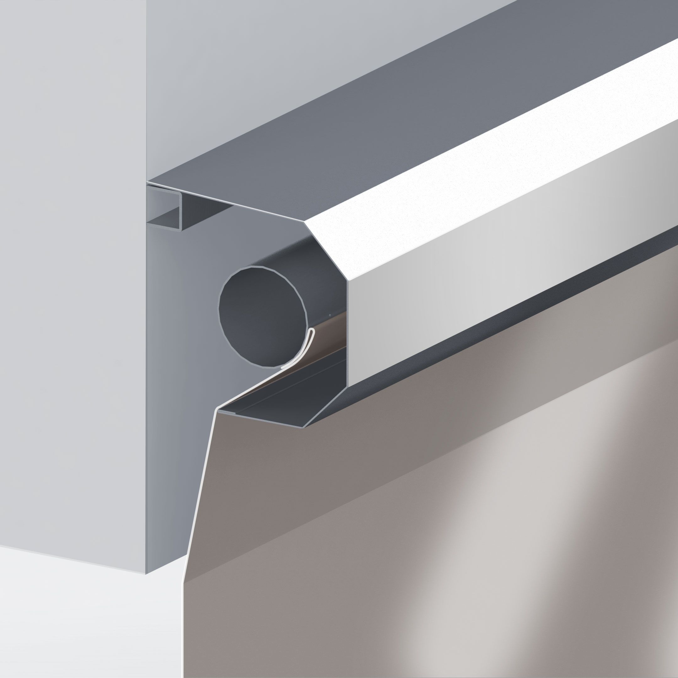 La puerta rápida enrollable DYNACO D-313 con dimensiones compactas y un diseño estético cabe en lugares donde el espacio es limitado. Incluso en una sala de exposición o tienda. Su motor se incorpora en el tambor y se oculta detrás de vainas negras. Combinado con las cubiertas de guías laterales y tambor de color de aluminio o el color de su elección, esto se traduce en un aspecto impresionante.
