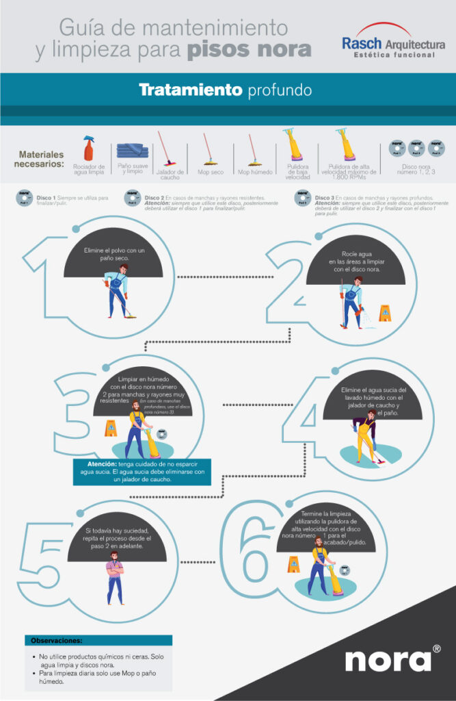 A continuación encontrarás un procedimiento práctico y probado –basado en las mejores prácticas de Rasch Arquitectura y en las recomendaciones oficiales de nora®– para que tu equipo de limpieza obtenga resultados profesionales con el menor esfuerzo.